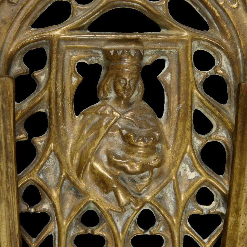 Heurtoir de porte néo gothique en bronze. Architecture en ogive ajourée, effigie de Marie Tudor au centre, datée ''Ao. MDXVI'' ( 1516 )