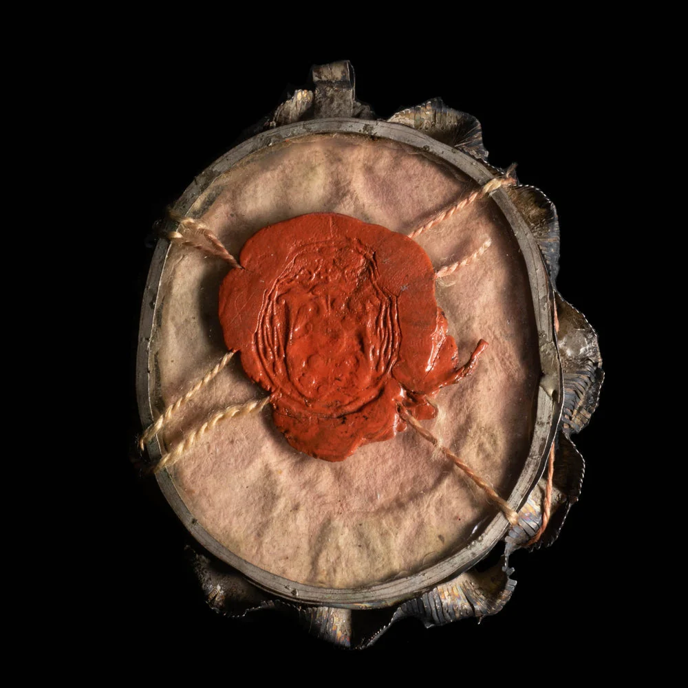 Rare reliquaire en argent avec deux façades en verre, contenant la relique de Saint Charles Borromée . La relique est fixée sur un fond de tissus rouge orné de fils d'argent et de paperolles, elle est identifiée en latin sur une étiquette manuscrite. comme S.Caroli épi caro.