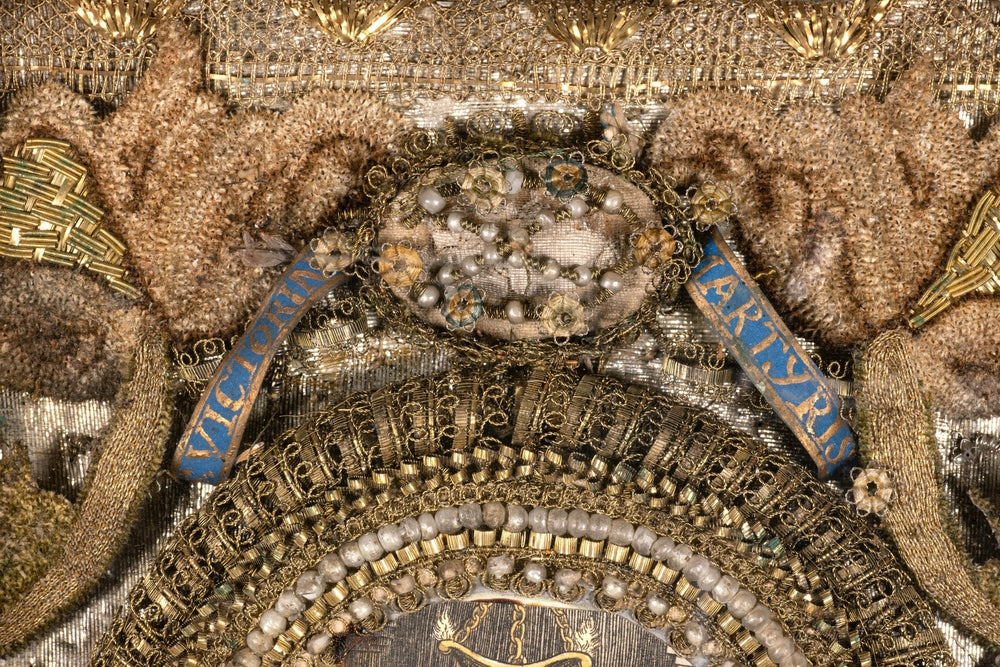 Magnifique travail a rapprocher des reliquaires contenant les restes de saints martyrs provenant des catacombes de Rome et ornés d'or et de bijoux que l'on peut encore voir en Suisse et dans le sud de l'Allemagne ( par exemple a l'Abbaye de Waldsassen )
