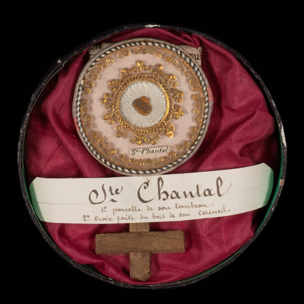 Médaillon reliquaire a encadrement de bois noirci contenant des reliques de Sainte Chantal, une parcelle de son tombeau et une croix faite du bois de son cercueil.
